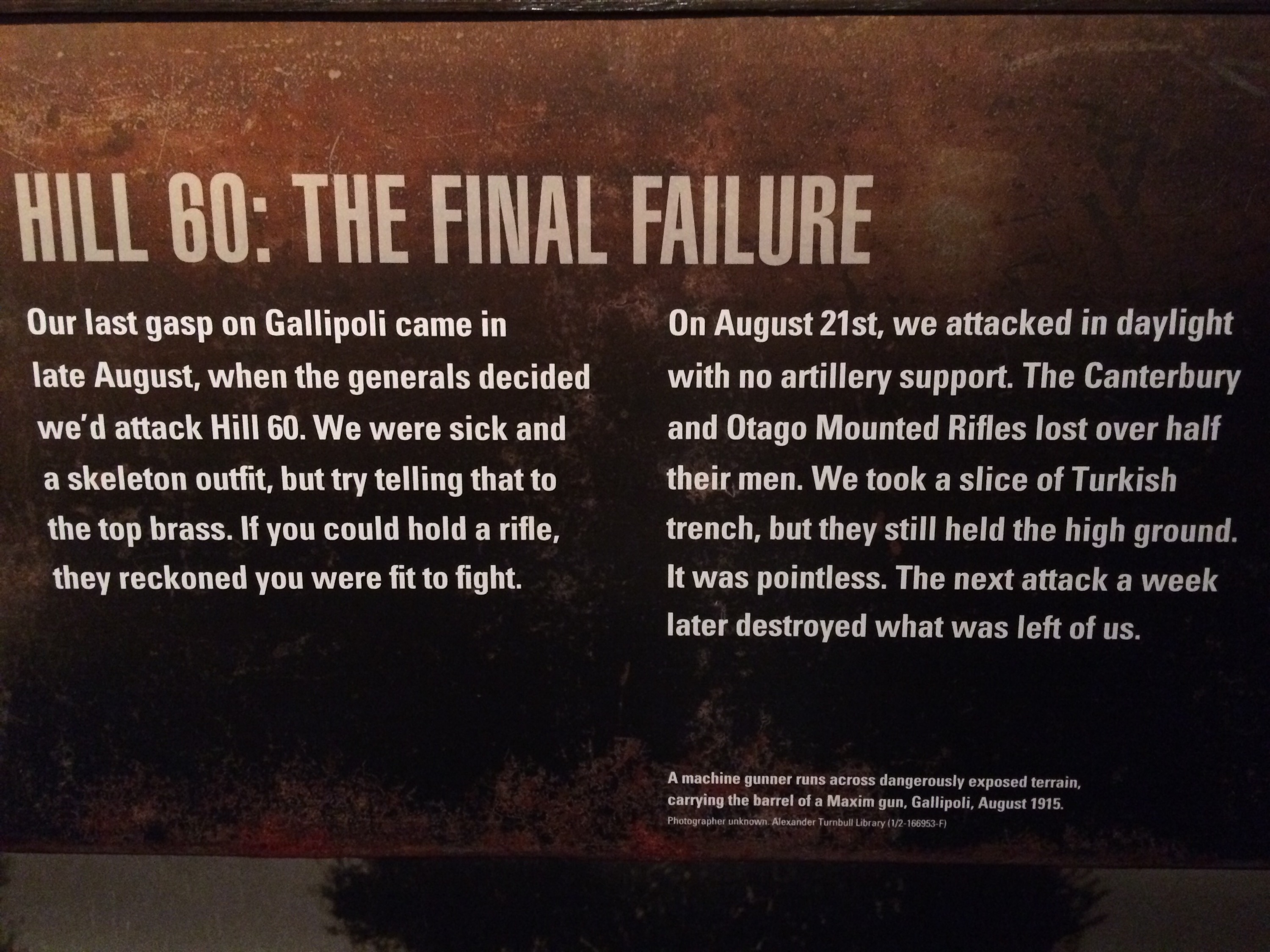 There was a superlative exhibit on World War I’s battle of Gallipoli at Te Papa. Each “room” of the exhibit was dedicated to story of someone connected to the war. The Weta workshop crafted giant oversized statues of each war hero. They worked off of still lifes from the era, but out of respect for the dead, used the faces of Weta employees who liked similar (in some cases eerily similar) to the heroes.