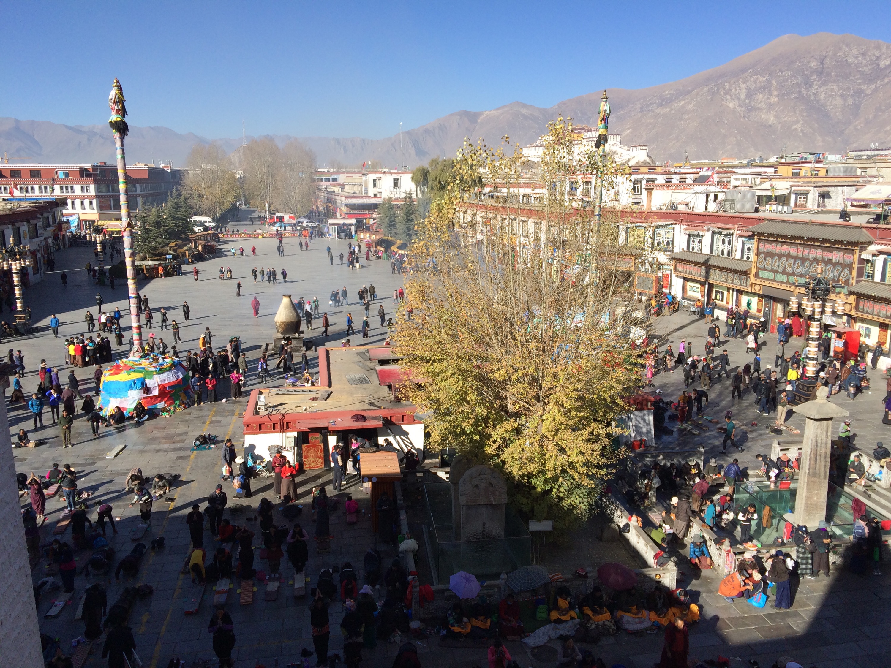 Overlooking Barkhor Square from the rooftop. You can see the devout walking the kora clockwise around the temple.