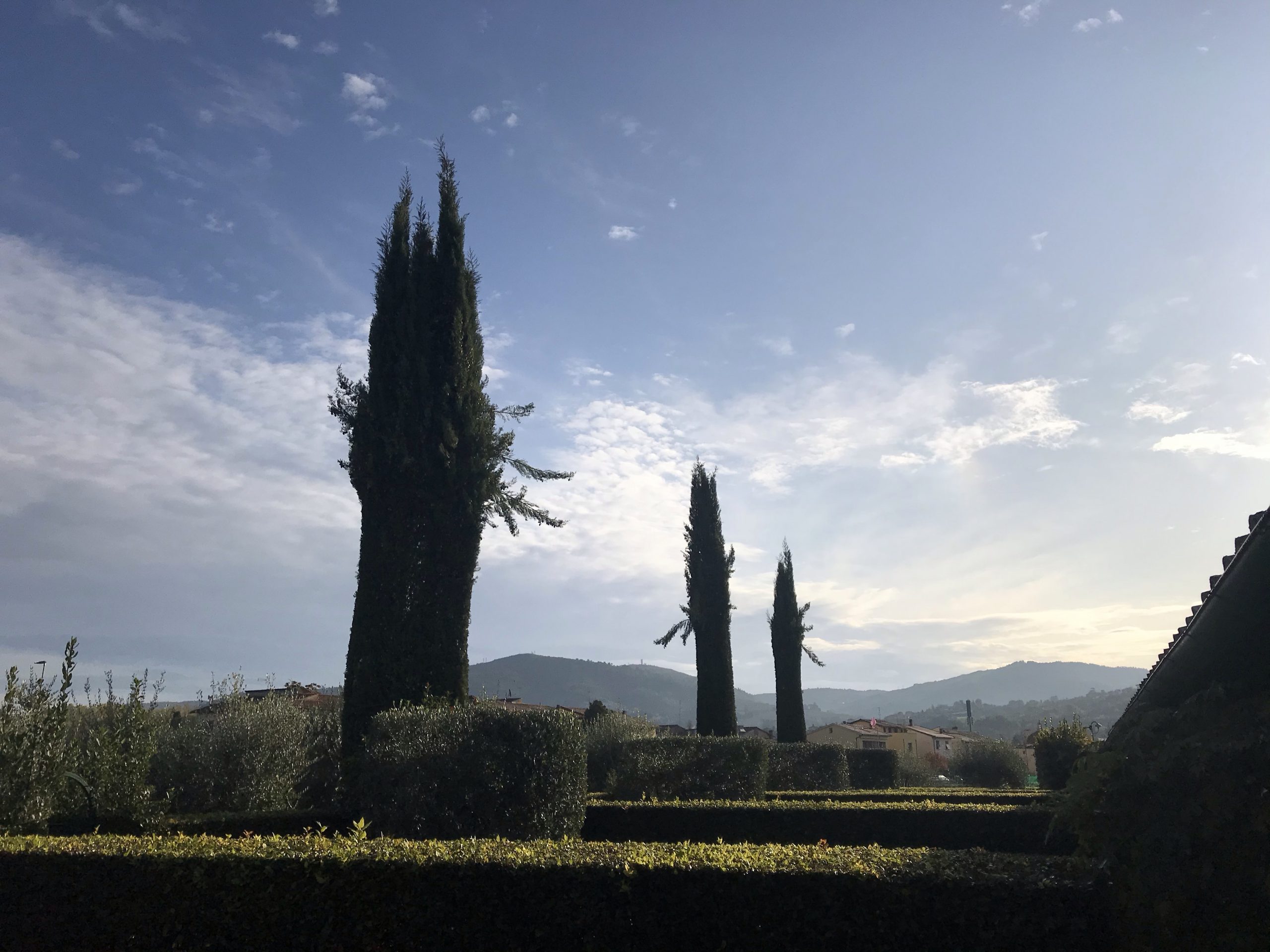 View of the row of (unkempt) Italian cypresses against the Tuscan sky from my hotel room’s little private garden.