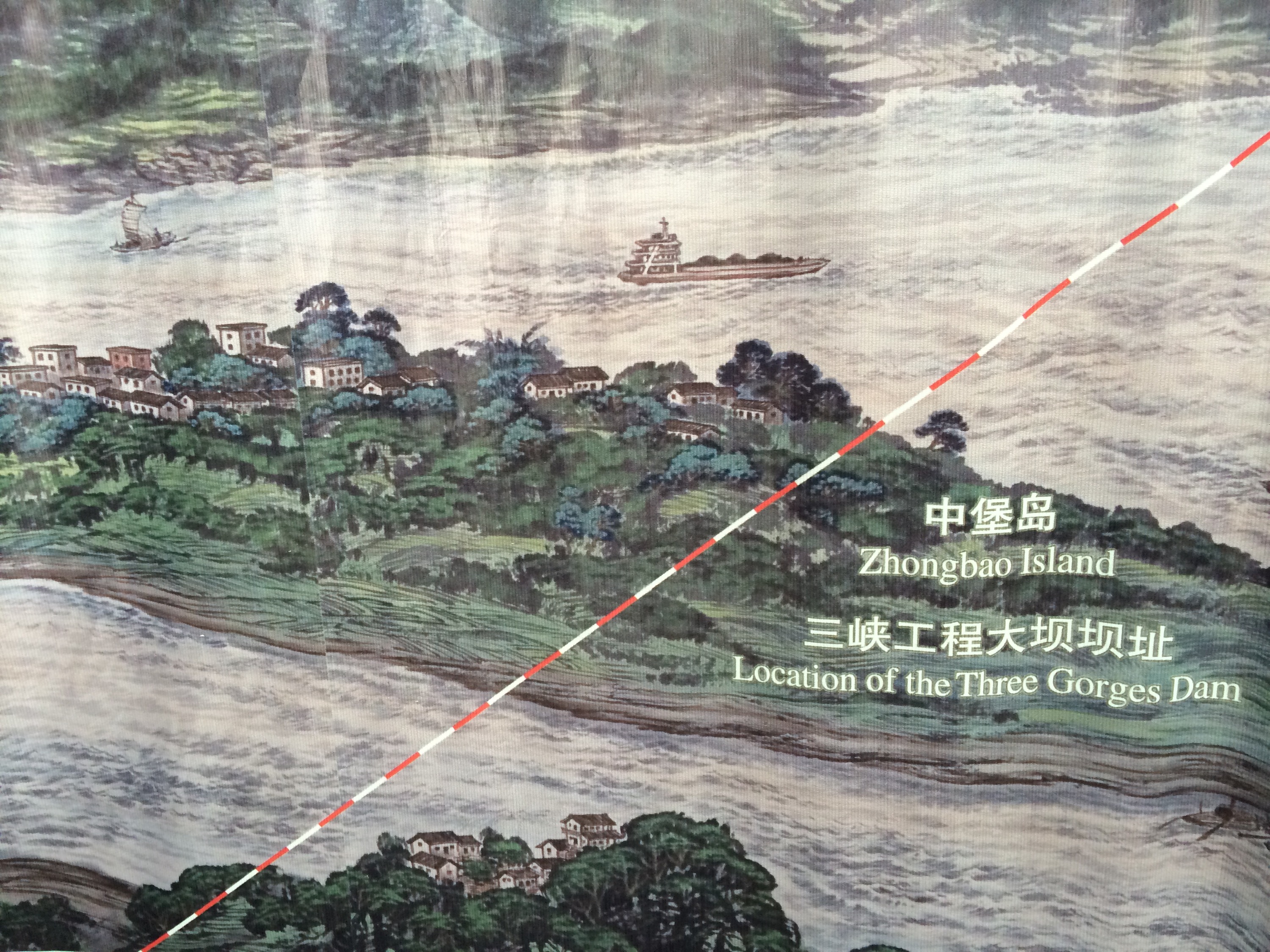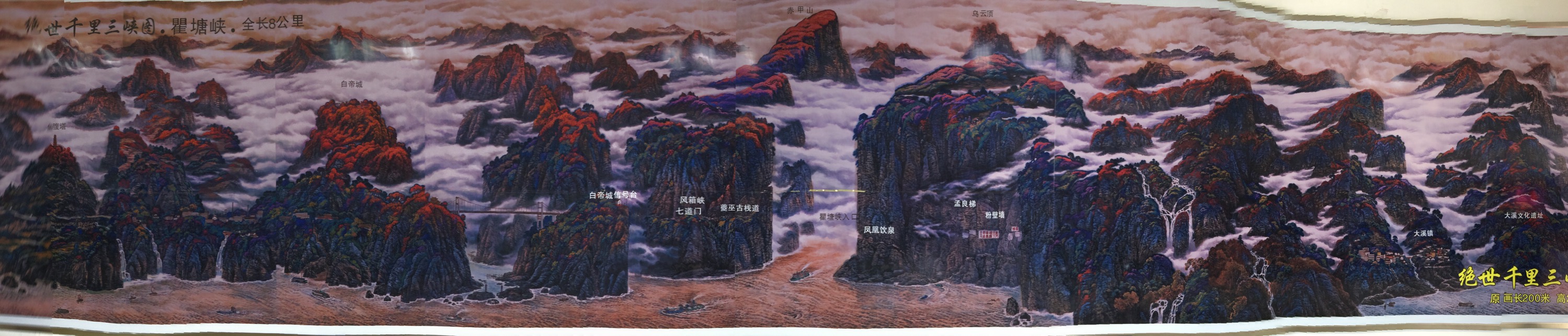 The red and white line across this painting represents where the bridge stands now, across the Xiling Gorge (the first of the Three Gorges.)