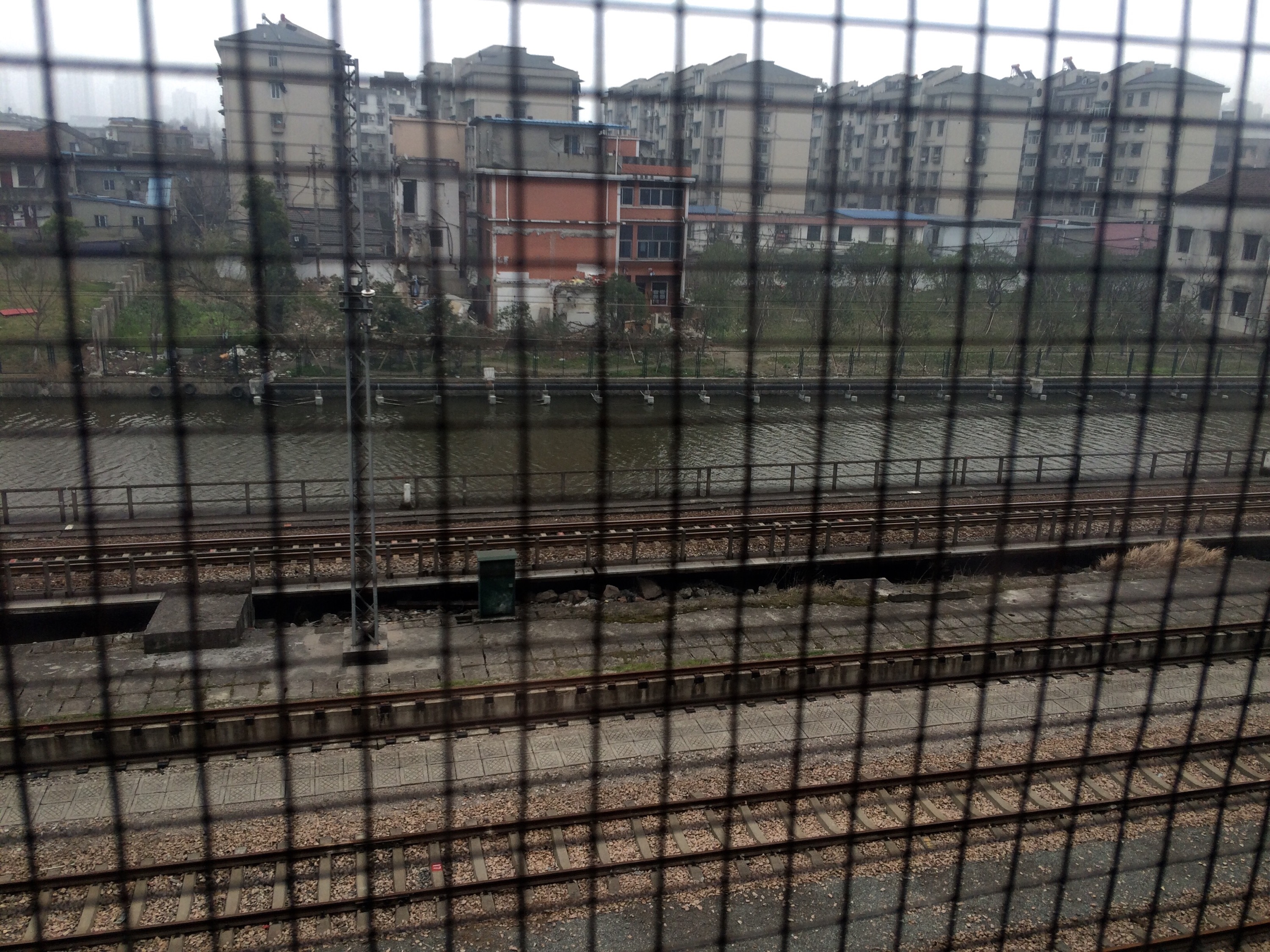 Fence.  Train tracks.  Canal.  Crumbling buildings.  China.