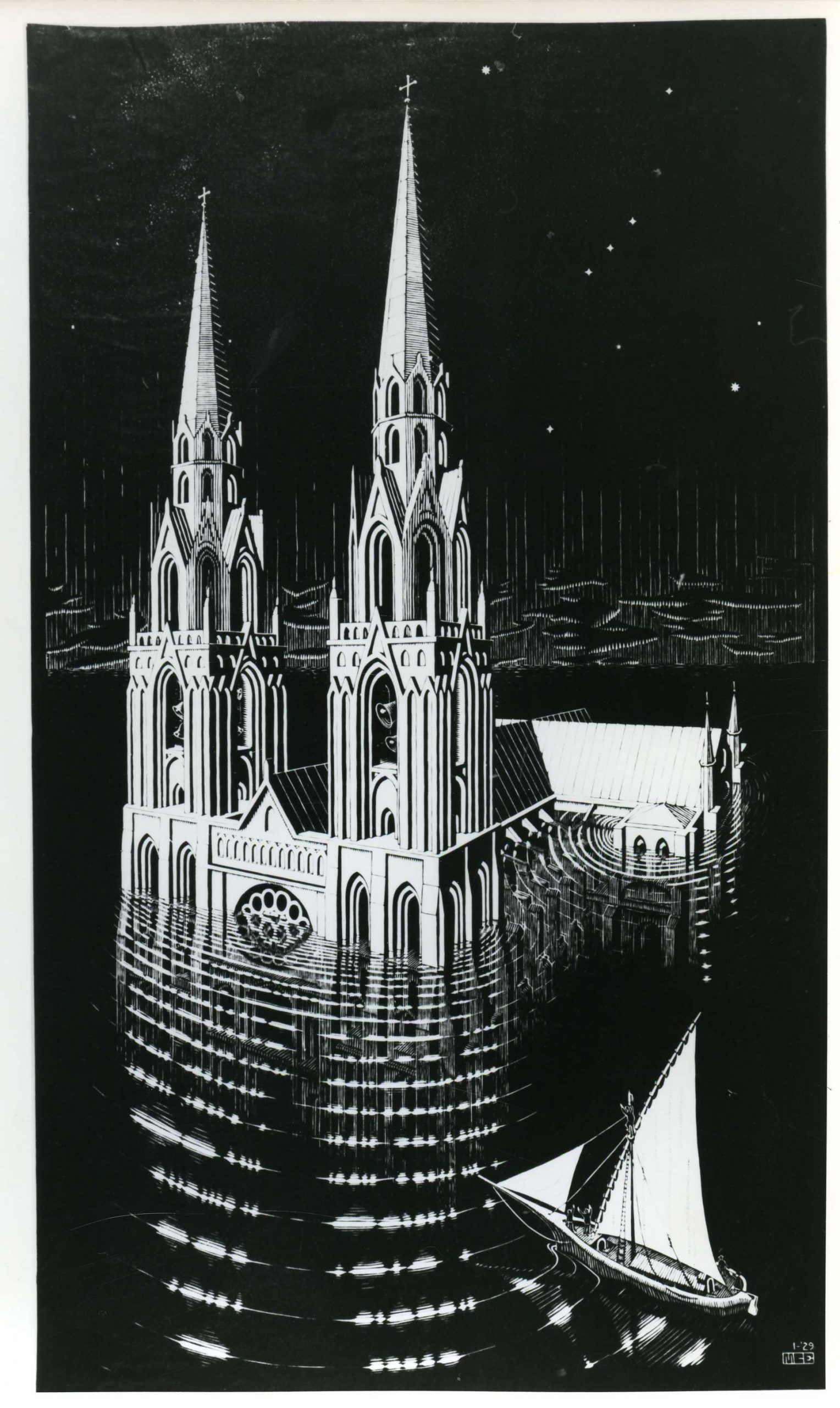 The design reminded me of M.C. Escher‘s “drowned cathedral” which I had on a tshirt as a kid.