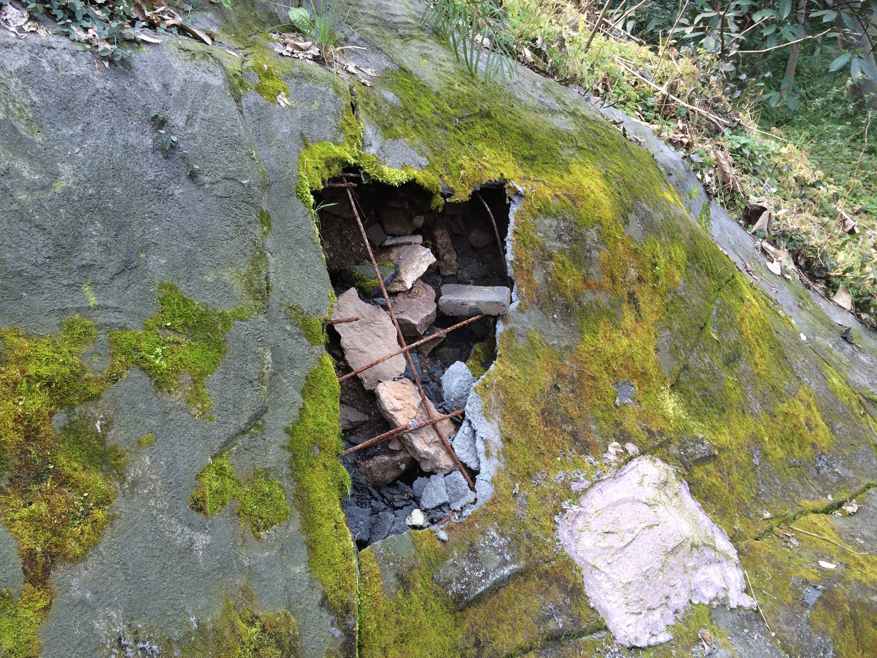 Damn you, Chinese Imagineers! Moss-covered “stone” giving way to rebar? The spell is broken!