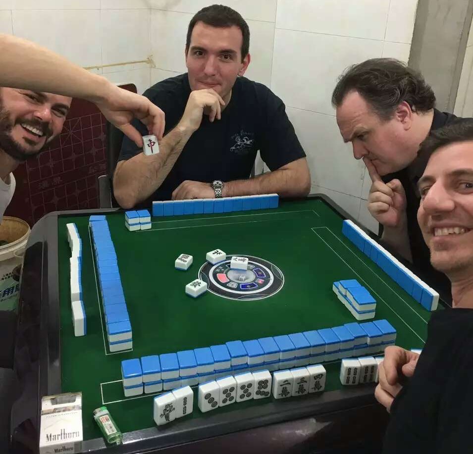 What you can’t see in the picture is the reverse angle where dozens of old and middle-aged Chinese men and women are staring at the crazy 老外, taking pictures of us on their phones, and shouting suggestions on what tiles to play! Eli & I got, like, zero help because they decided we actually knew what we were doing. Xavier, meanwhile, has a bunch of people yelling in his ear in Mandarin and his cell phone out trying to match the traditional Chinese characters on the tiles. We polished off all the alcohol along the way.