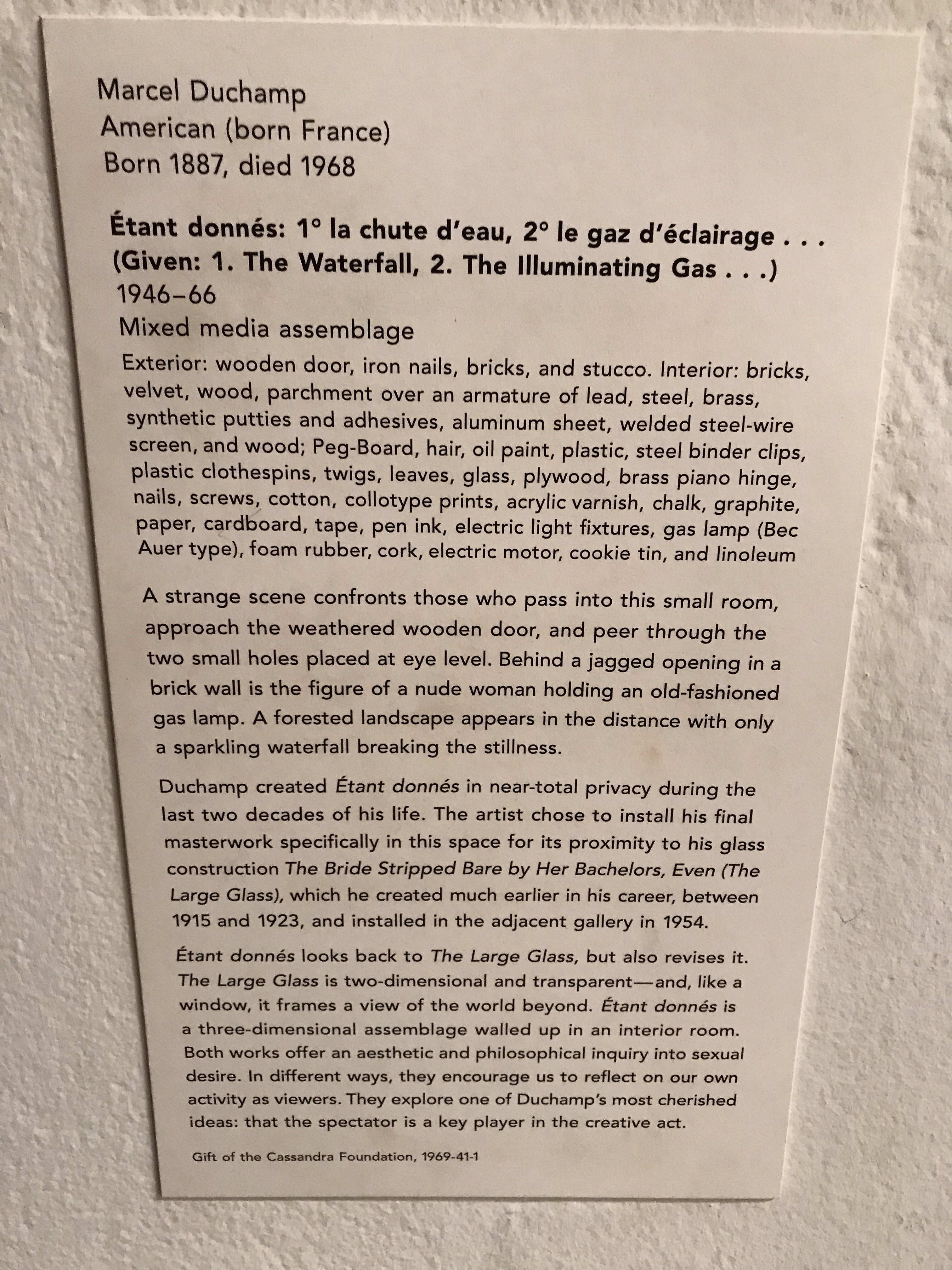 I was disturbed, as intended, by this Marcel Duchamp work. A closed door with a hole in it. Peering inside, you see the exposed, naked body of a woman.