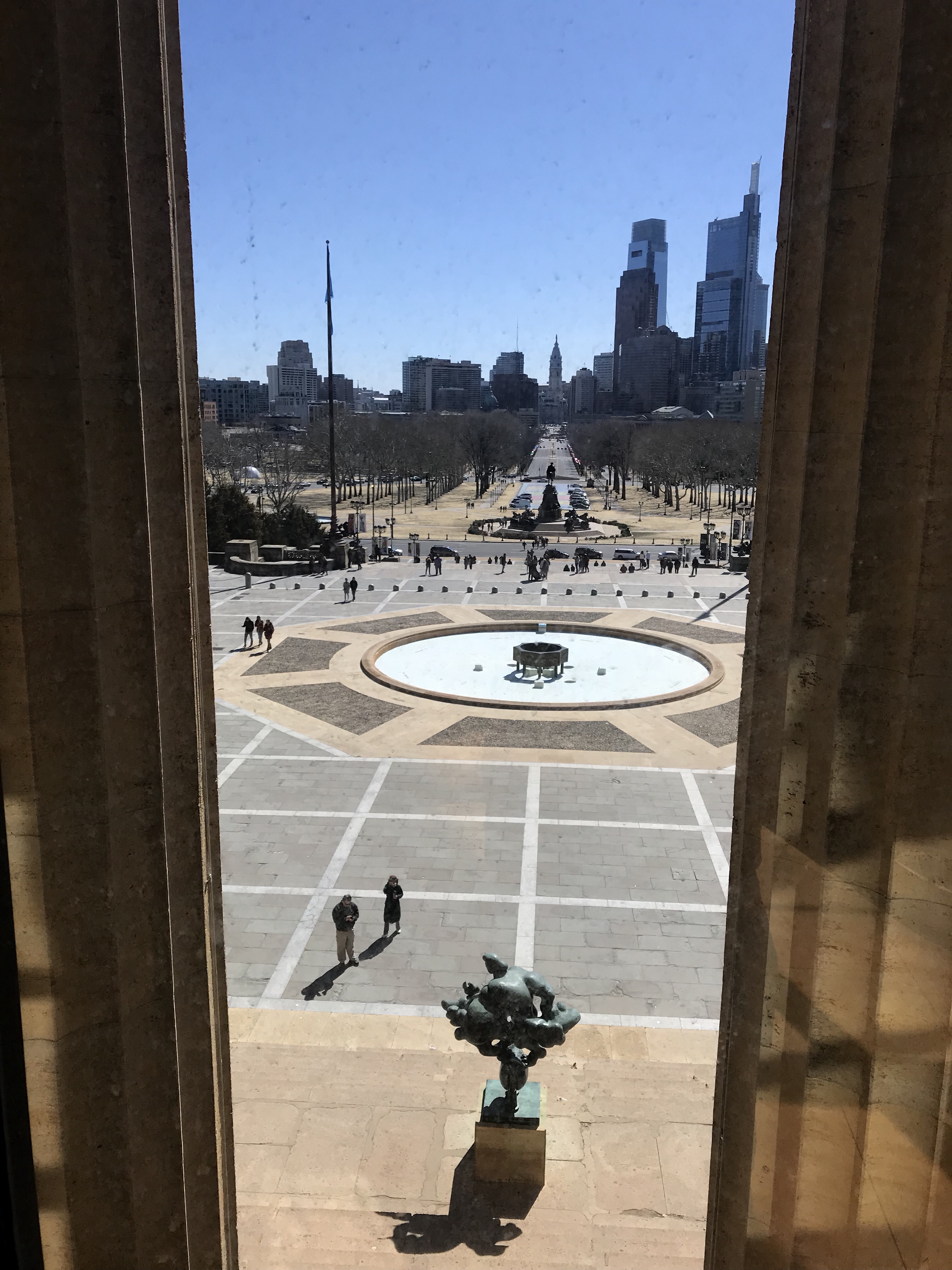 Looking out from the museum, down the museum steps, to the Washington Monument and the Philadelphia skyline beyond.