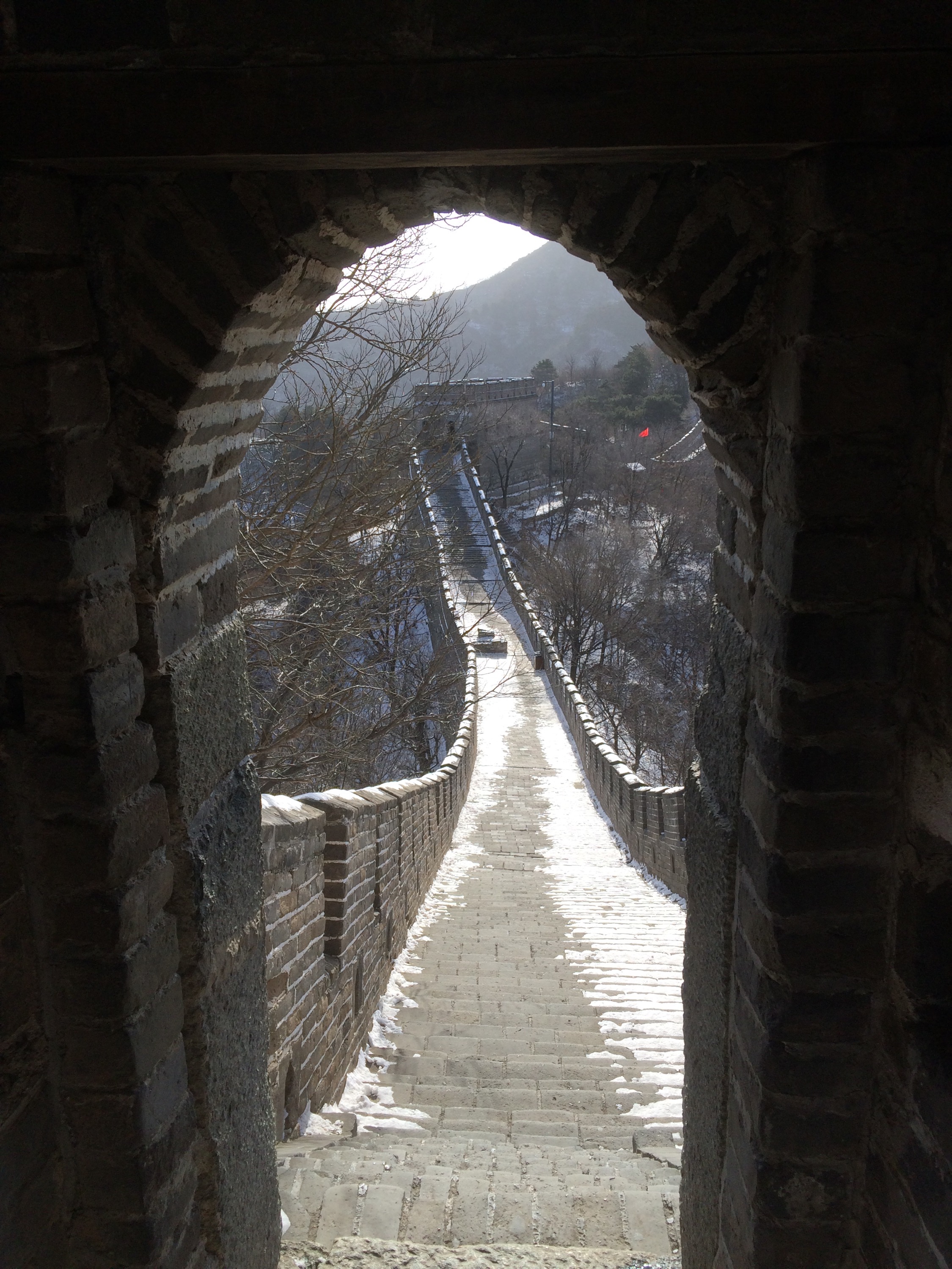 Wall: Looking out of a watchtower at the snow on the Great Wall