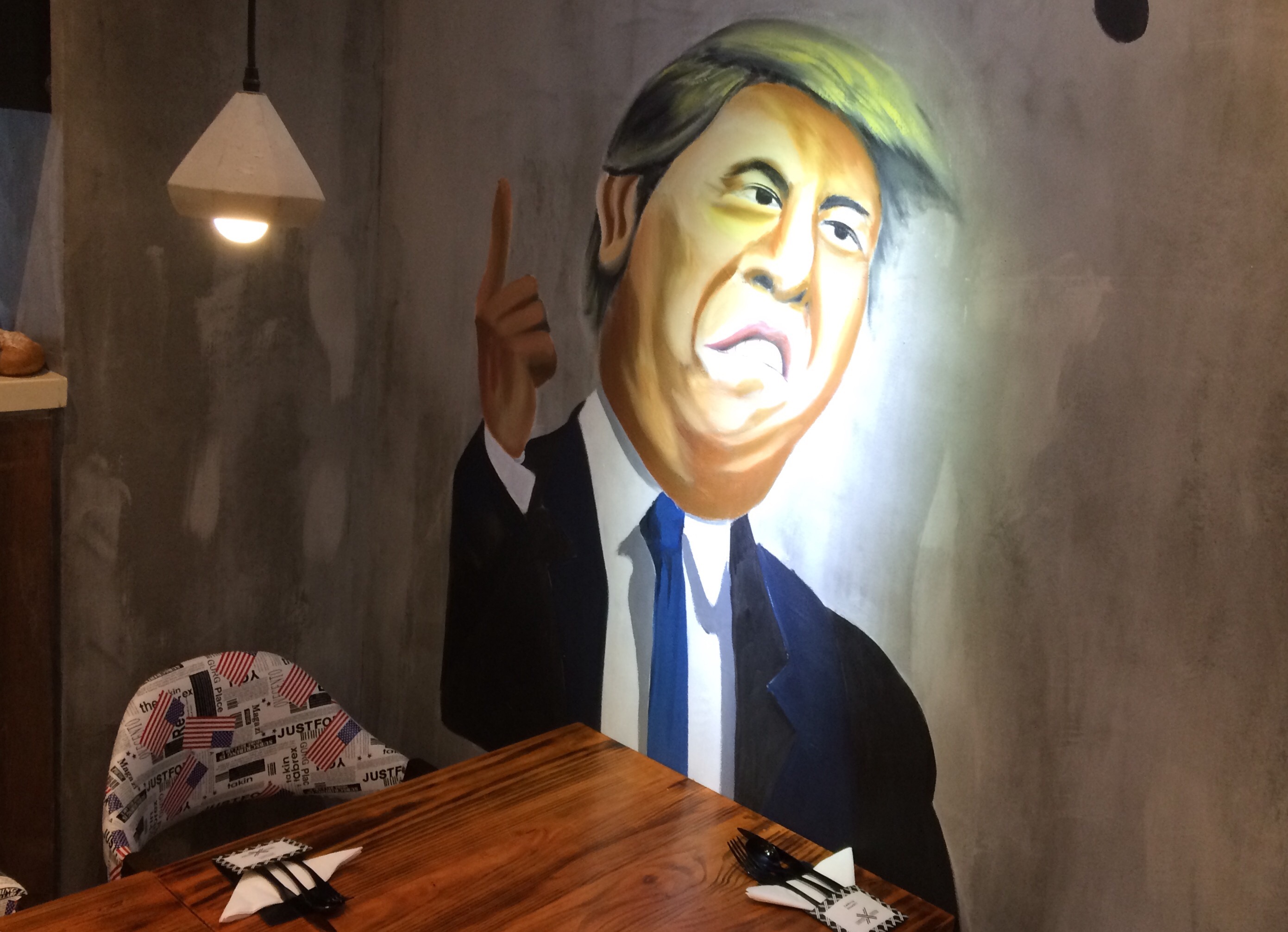 They painted a caricature of Trump on the wall at Lobster + Chicken. I can’t believe the America I’m going back to.