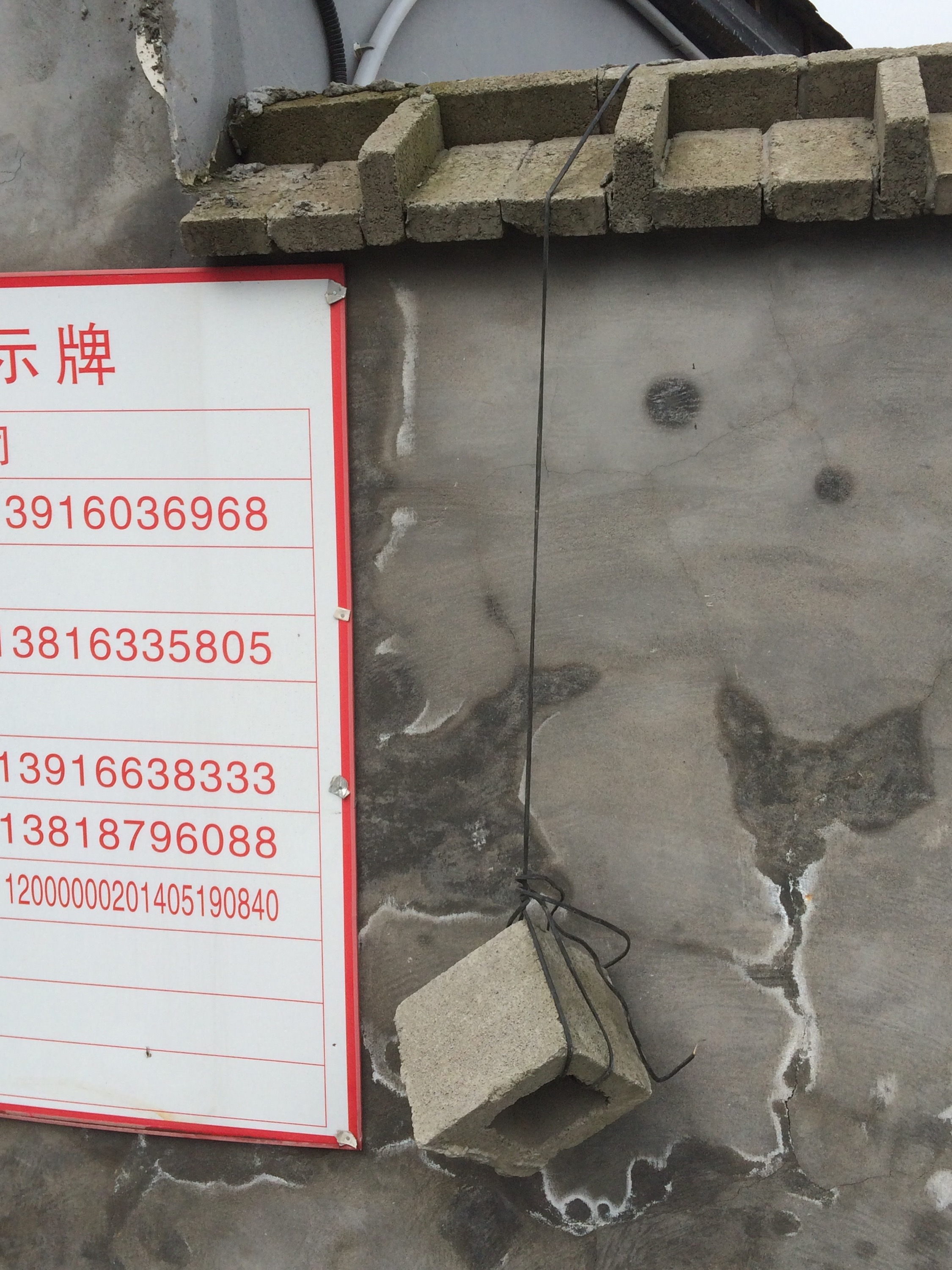 Half a cinder block hanging from a wire draped over a wall. But what’s hanging on the other side? What’s hanging on the other side?