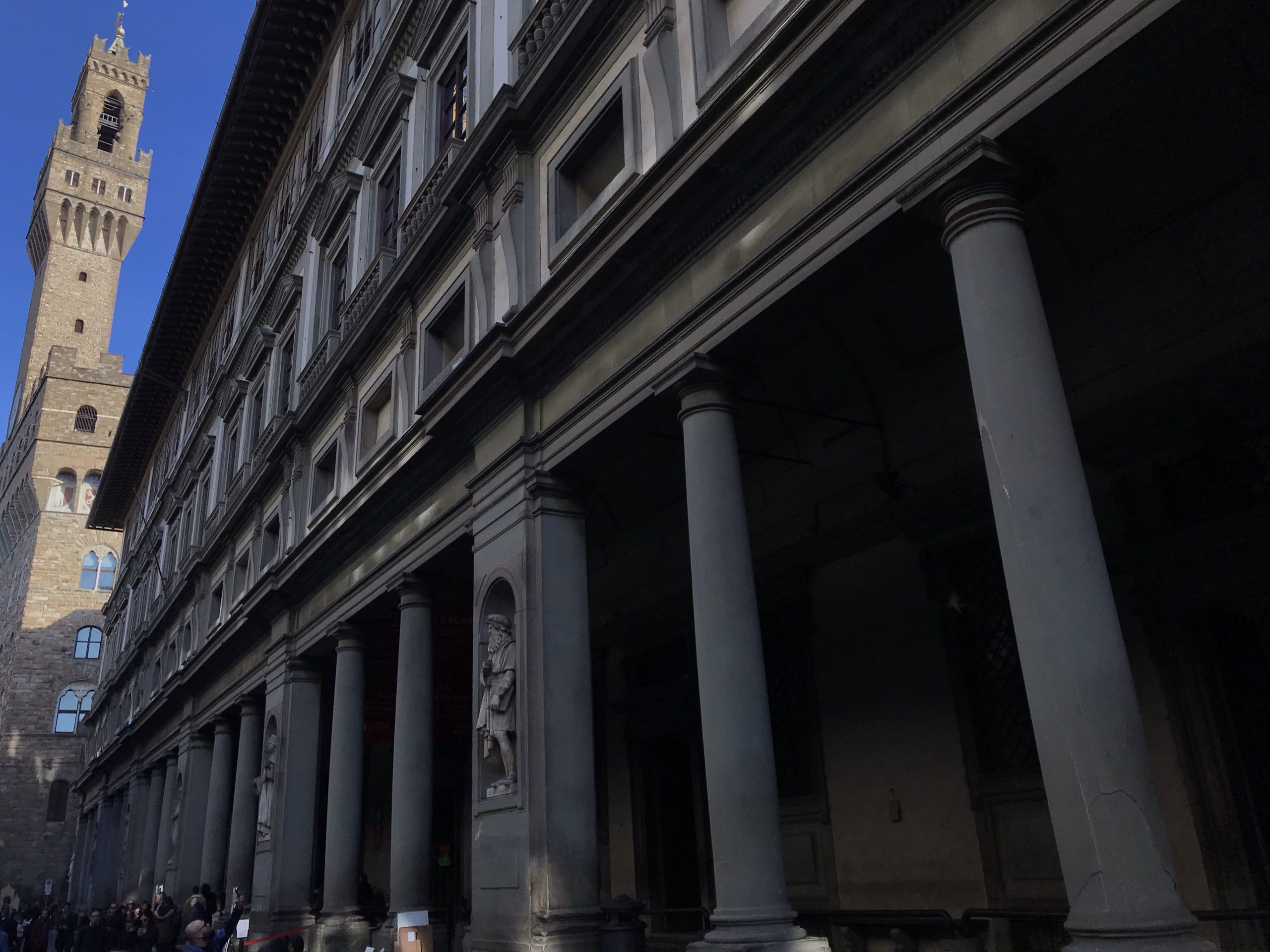 Florence’s “town hall” is the the Palazzo Vechio. As seen here from down the street by the Piazzale degli Uffiz, the “Old Palace” literally towers over the piazza.