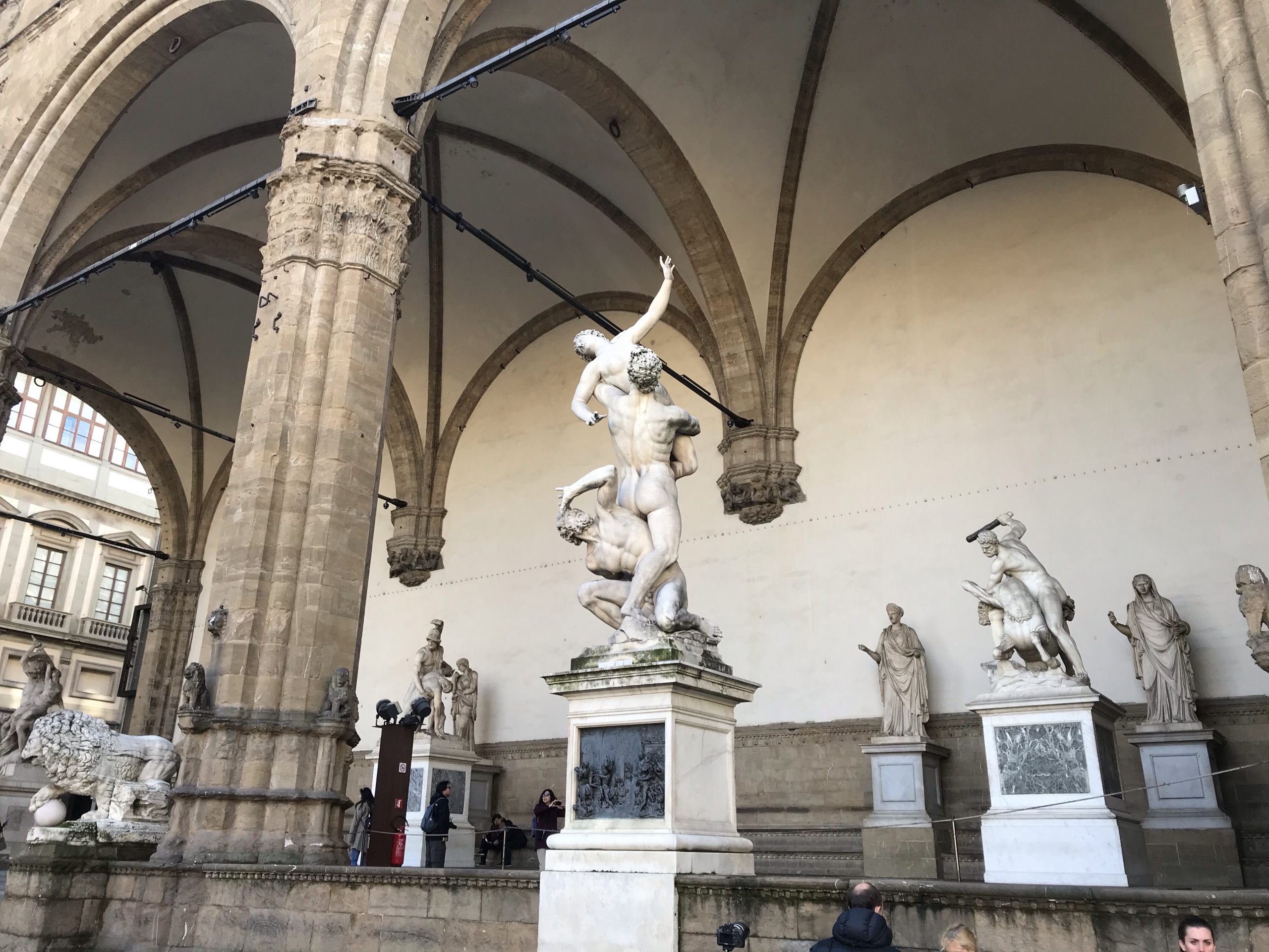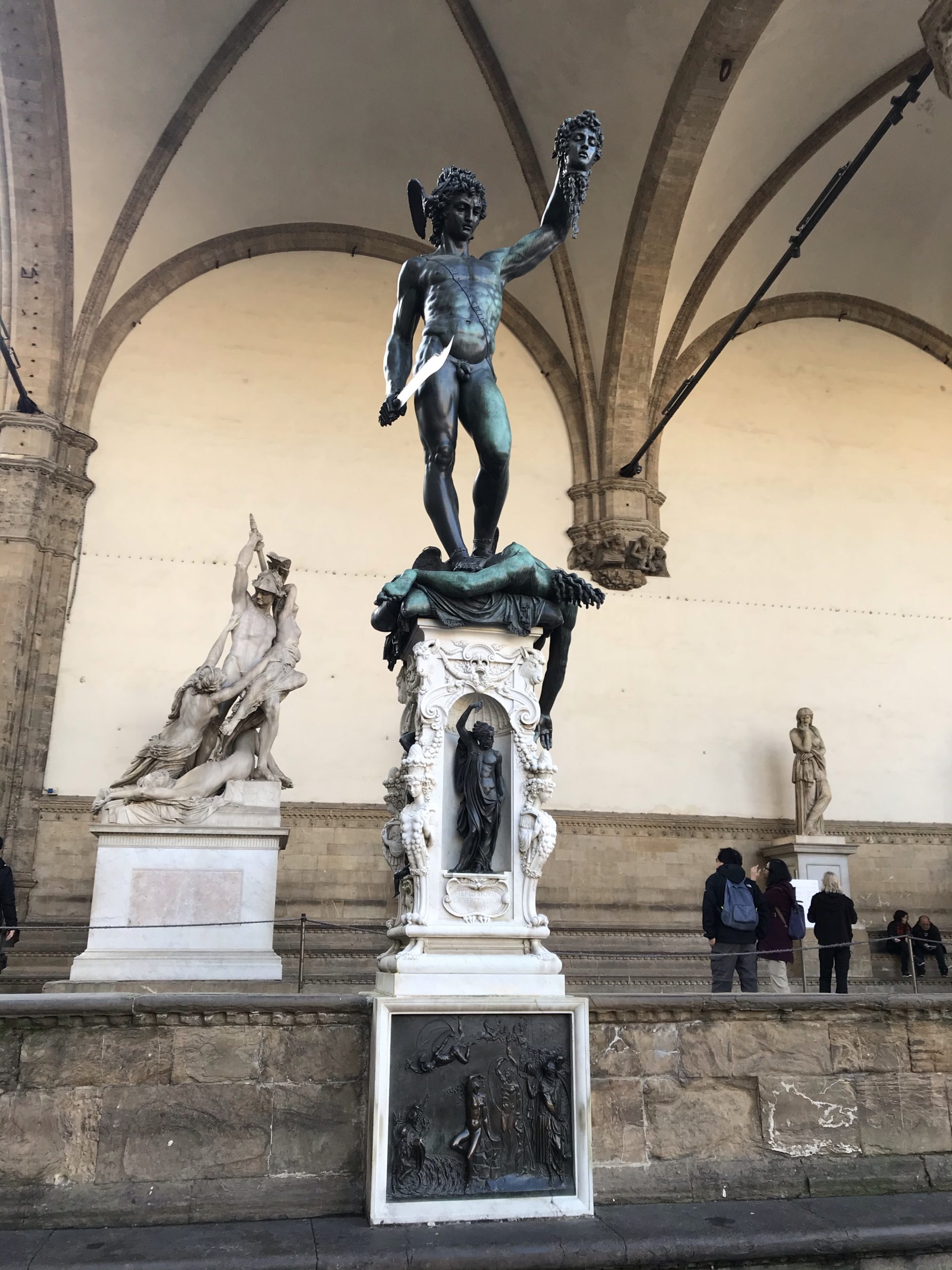 The Loggia dei Lanzi is a covered pavilion with a high arched ceiling showcasing statues like Perseus with the Head of Medusa…