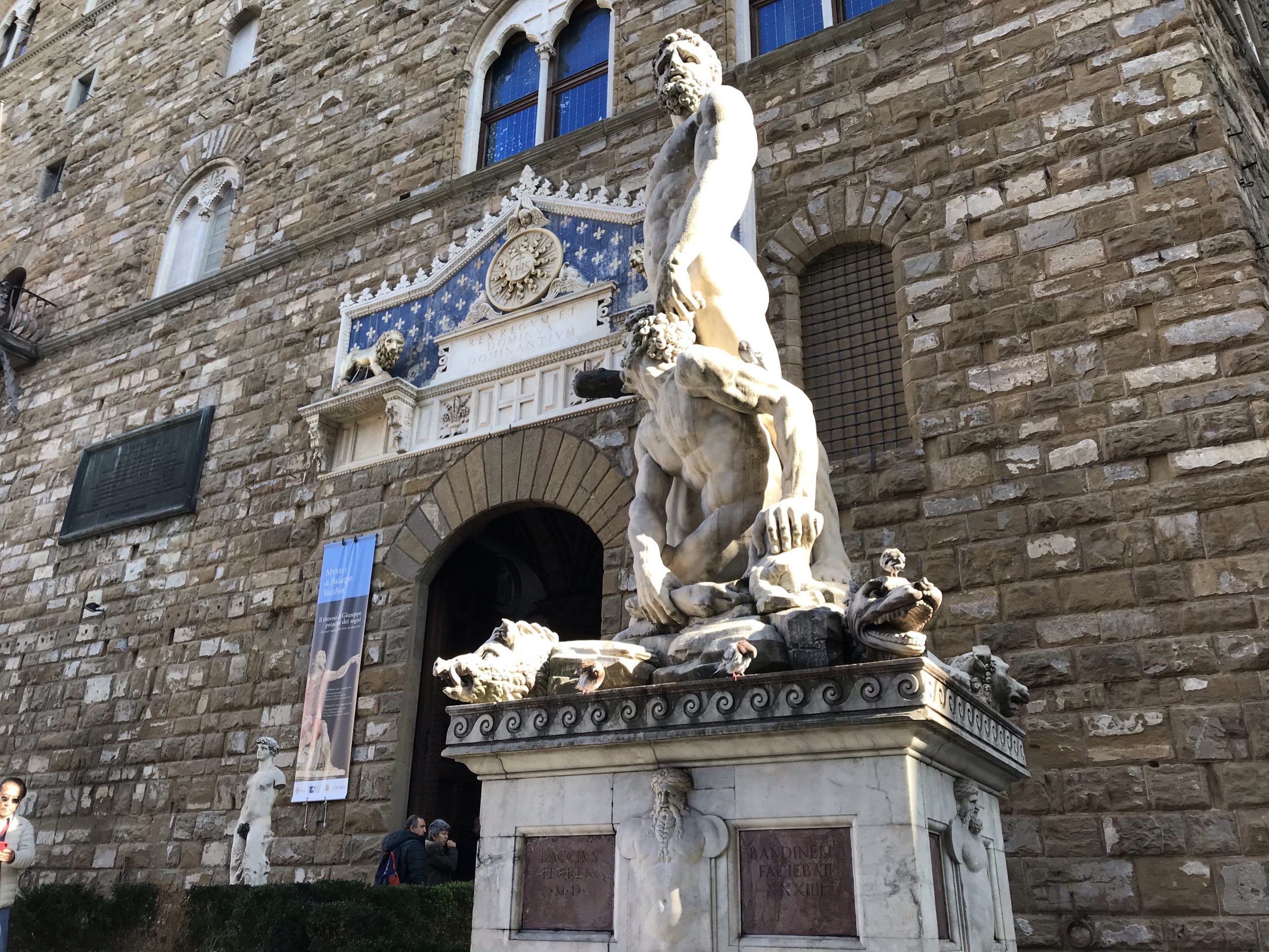 After its unveiling in 1505, Michelangelo’s David stood to one side of the palace’s entrance (until 1873 when it was moved to Galleria dell’Accademia and replaced with a replica.) On the other side of the entrance stands Baccio Bandinelli‘s statue of Hercules & Cacus (the giant, fire-breathing son of Vulcan.)