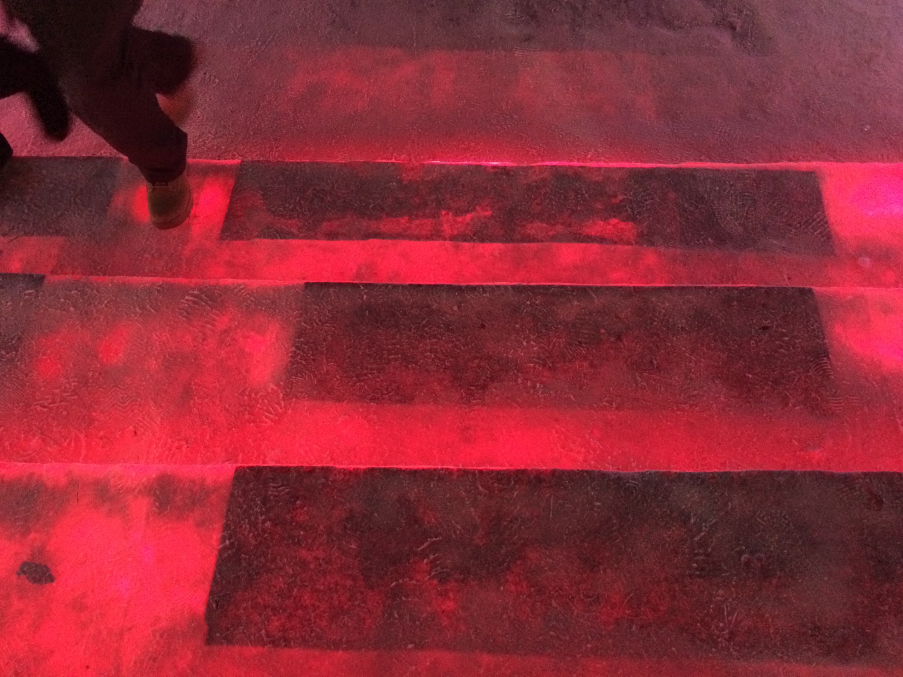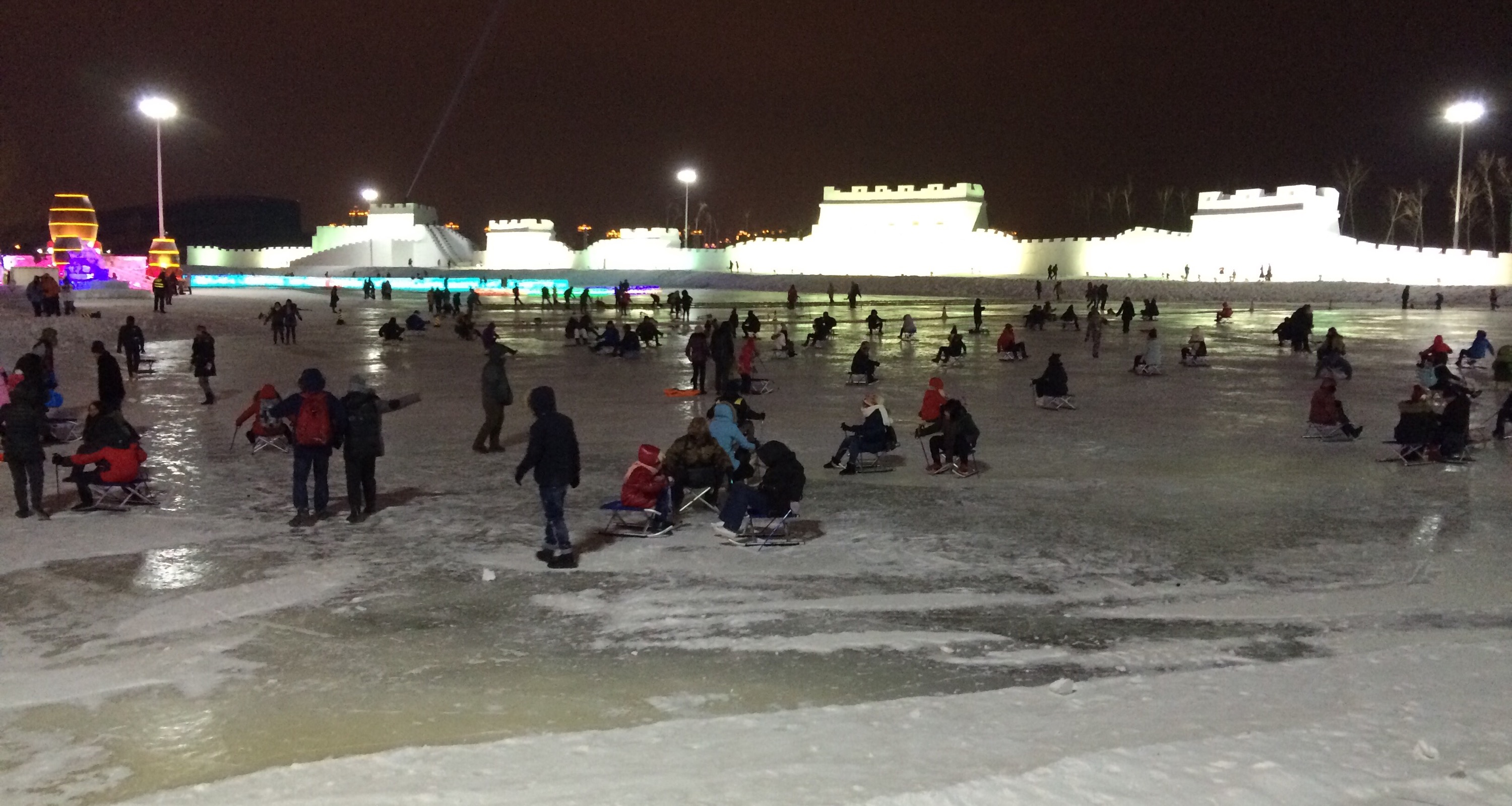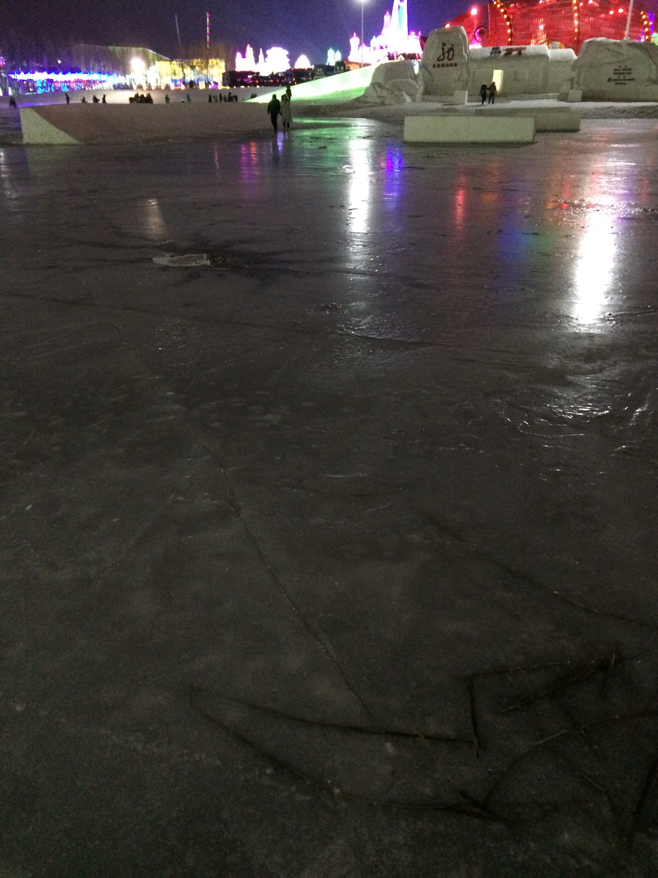 Snow covering the ice — and sometimes blowing along the ground in gelid flurries —  affords traction.  As does strips of carpet, judiciously frozen into place on steps.The whole thing is like Disneyland at Christmastime!  Although, to be honest, parking & concessions seemed to be run as badly as a county fair.