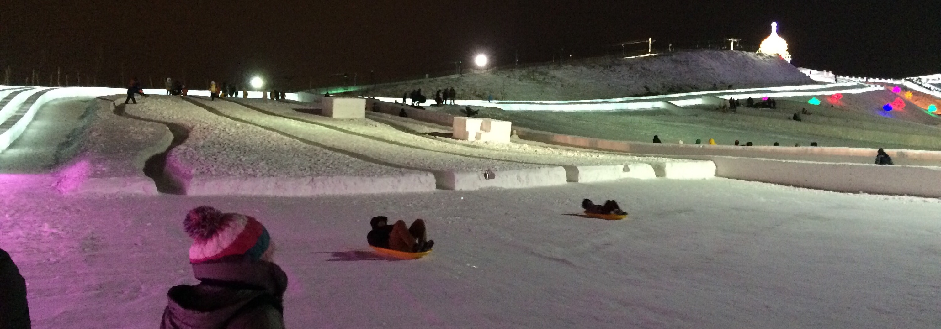 Children tobaggoned down giant slalom runs.
