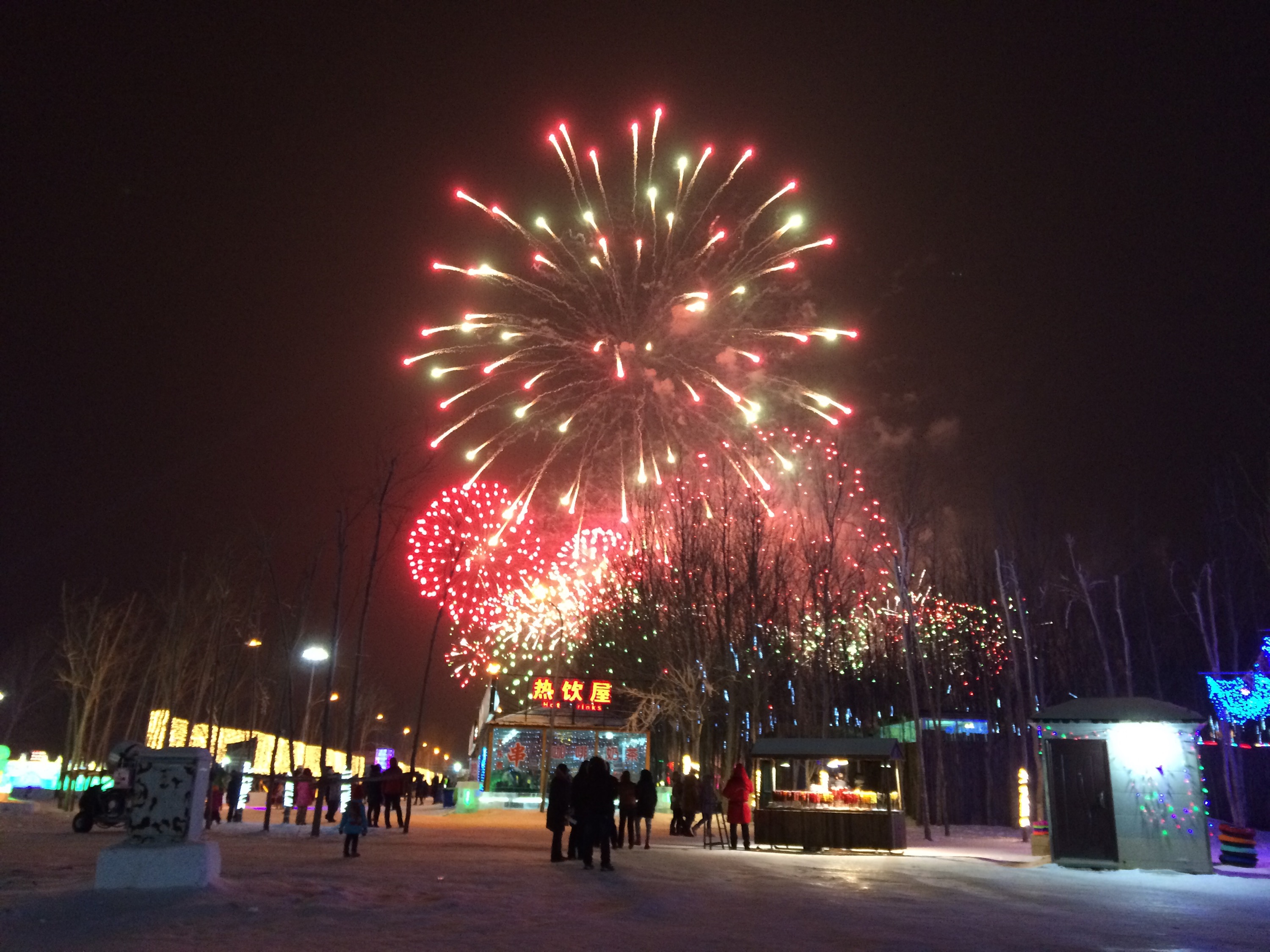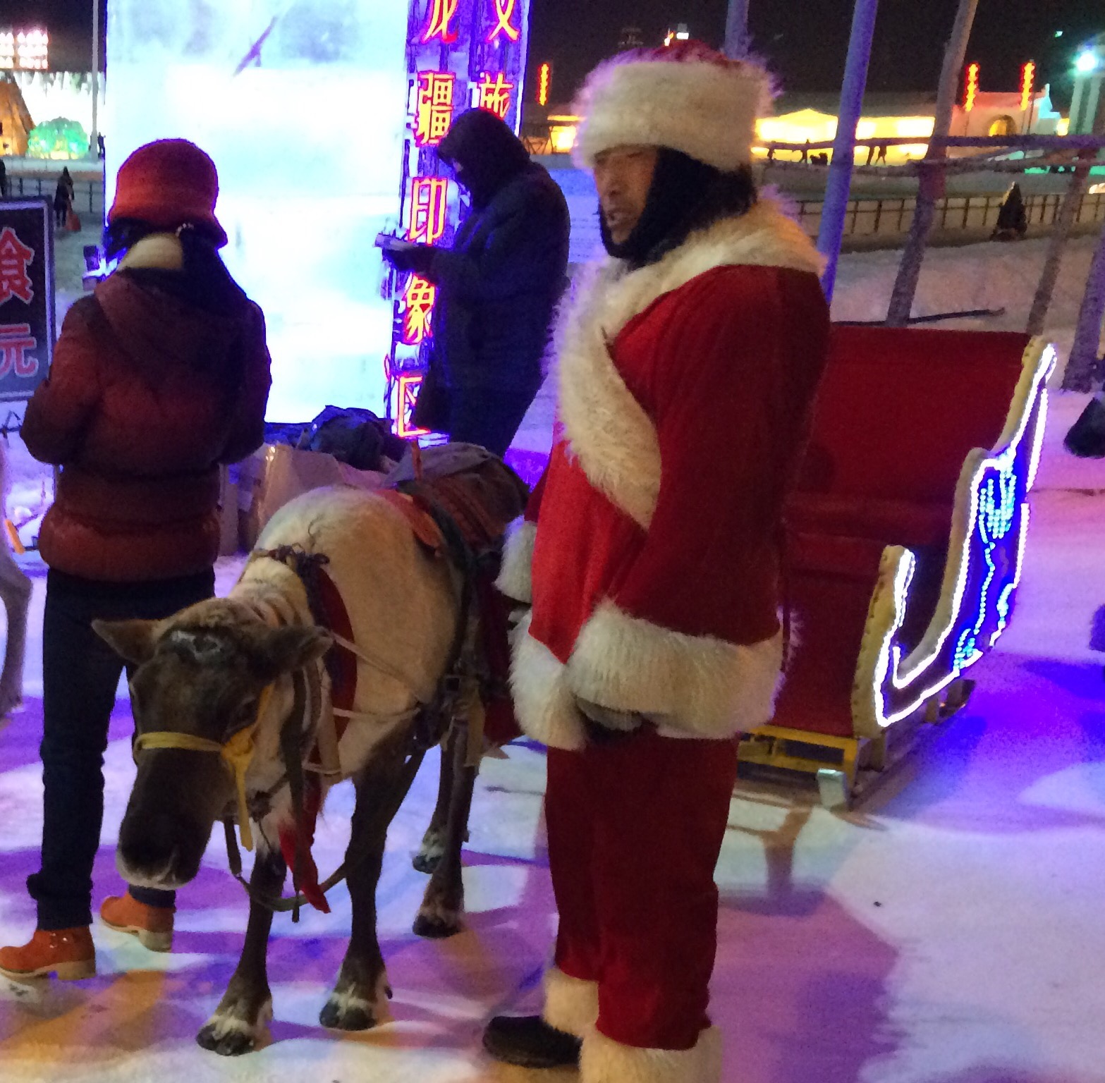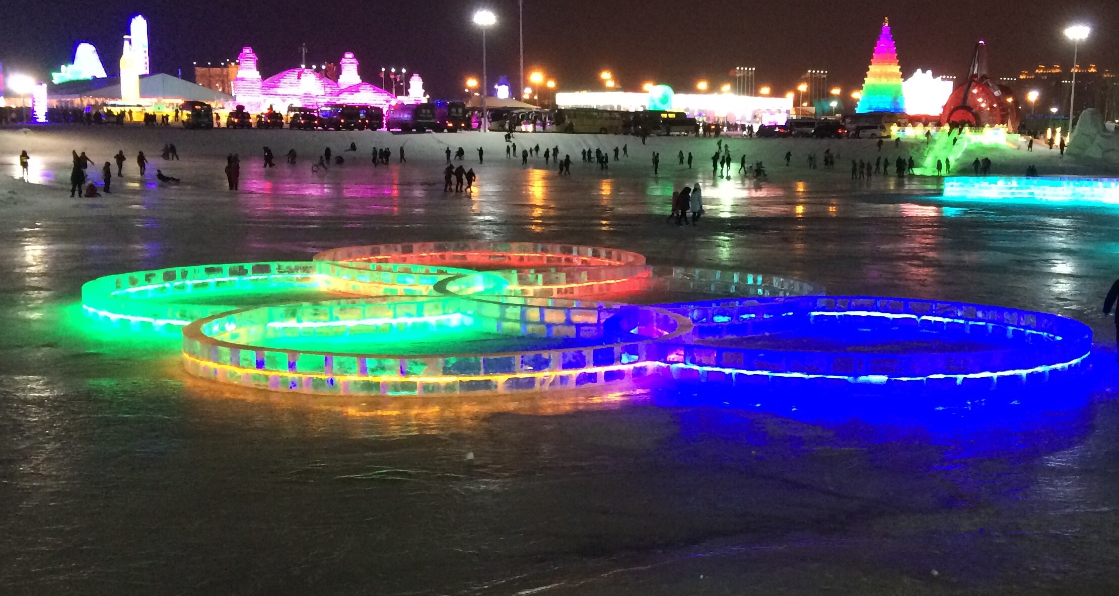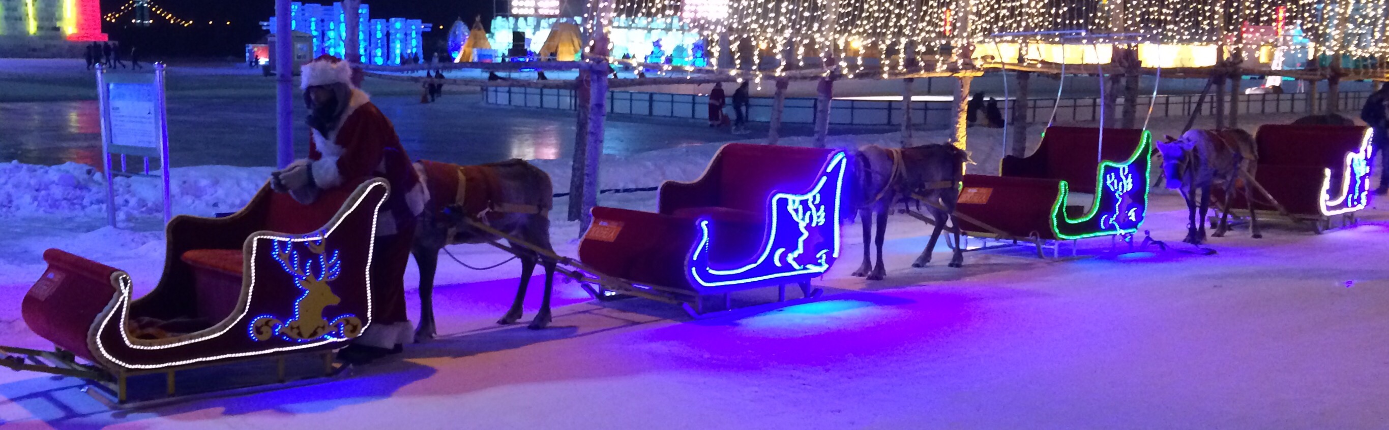 There was also a vast frozen lake for people to slide around on……dotted with playful designs like ice block “hedge mazes” or these Olympic rings.For a So Cal kid with a high center of gravity, walking across the ice was harrowing…..but if you ever get too tired of walking around, you can always take a ride in a reindeer-pulled sleigh!Insert obligatory “reindeer games” joke here.And then — just when you thought it couldn’t get any more like Disneyland — there were fireworks!
